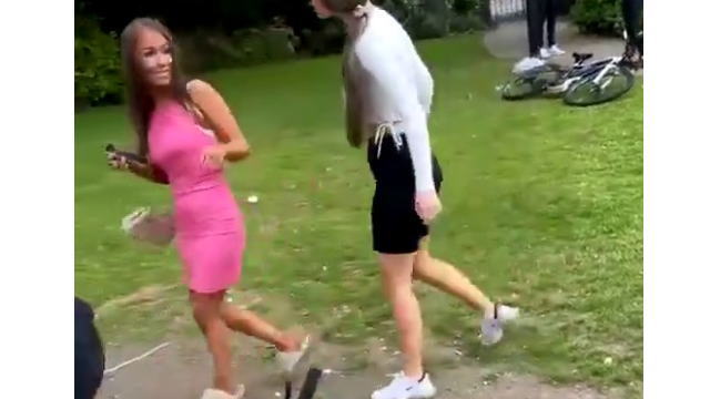 右側の女性がピンクの女性に何か言っている様子。返答が納得いかなかったのか右側の女性が殴り掛か…