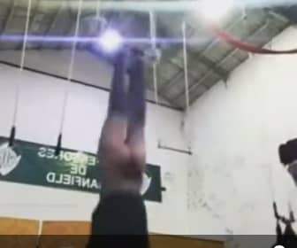 空中ブランコエクササイズをする女性。パンツが引っかかり脱げてしまう